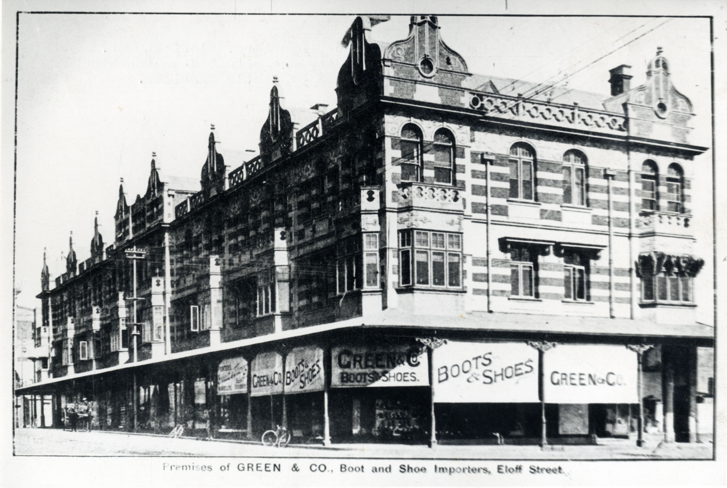 Green & Co., Boot & Shoe Importers, Eloff Street. This building was situated on the block now occupied by Castle Mansions. Image 706.