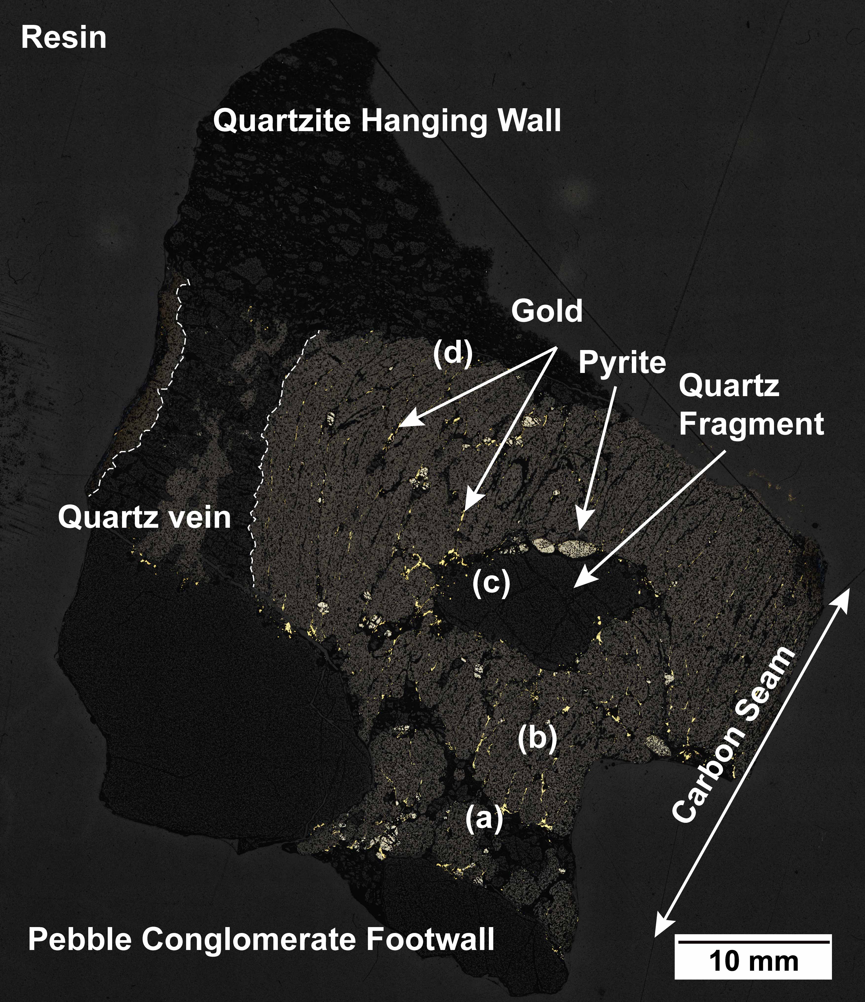 Petrography revealed that in more than 60 samples from carbon-bearing Witwatersrand Reefs, gold