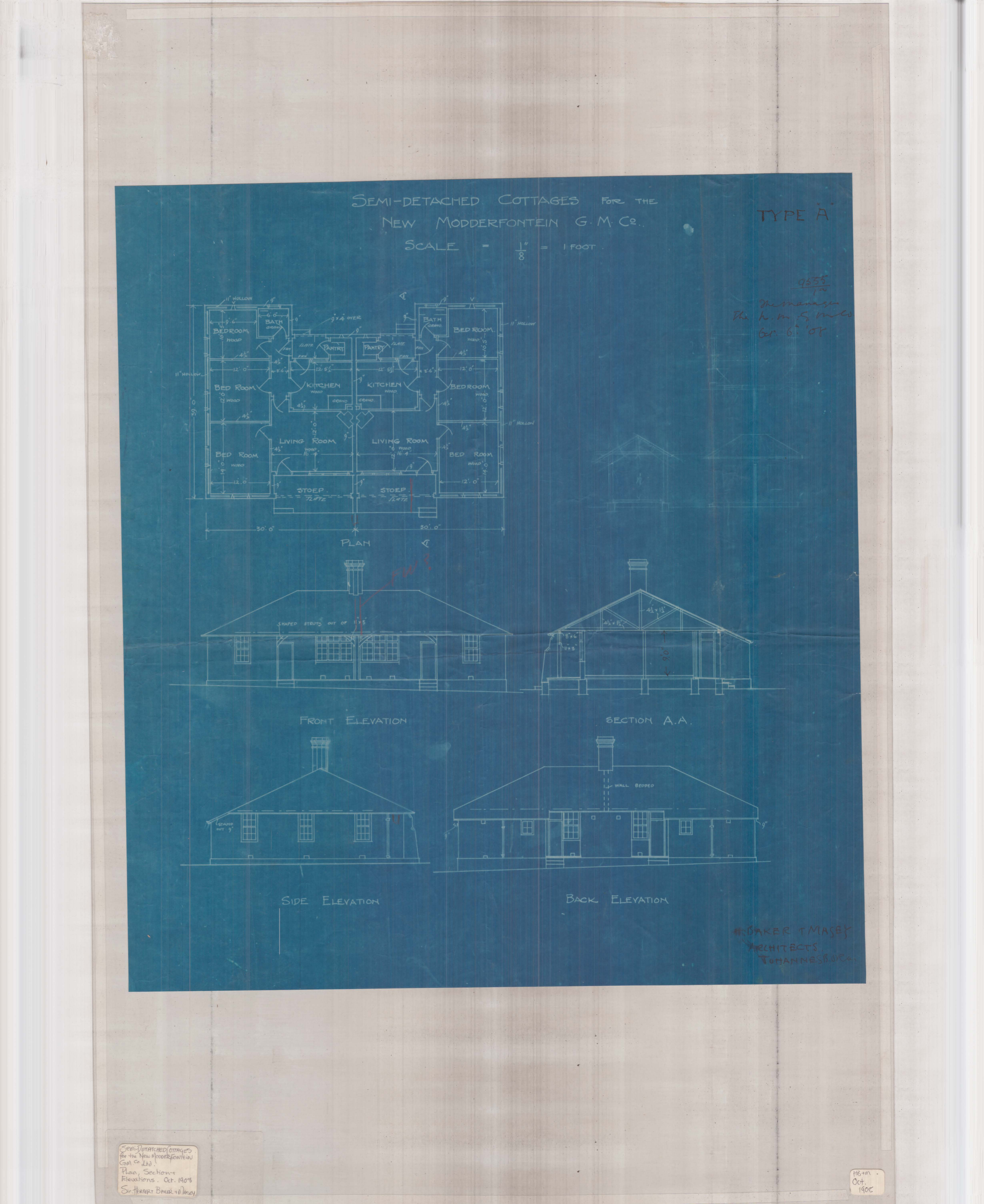 - Baker & Masey 1908. Modderfontein semi-detached cottages. Type A&B. Plans, sections & elevations