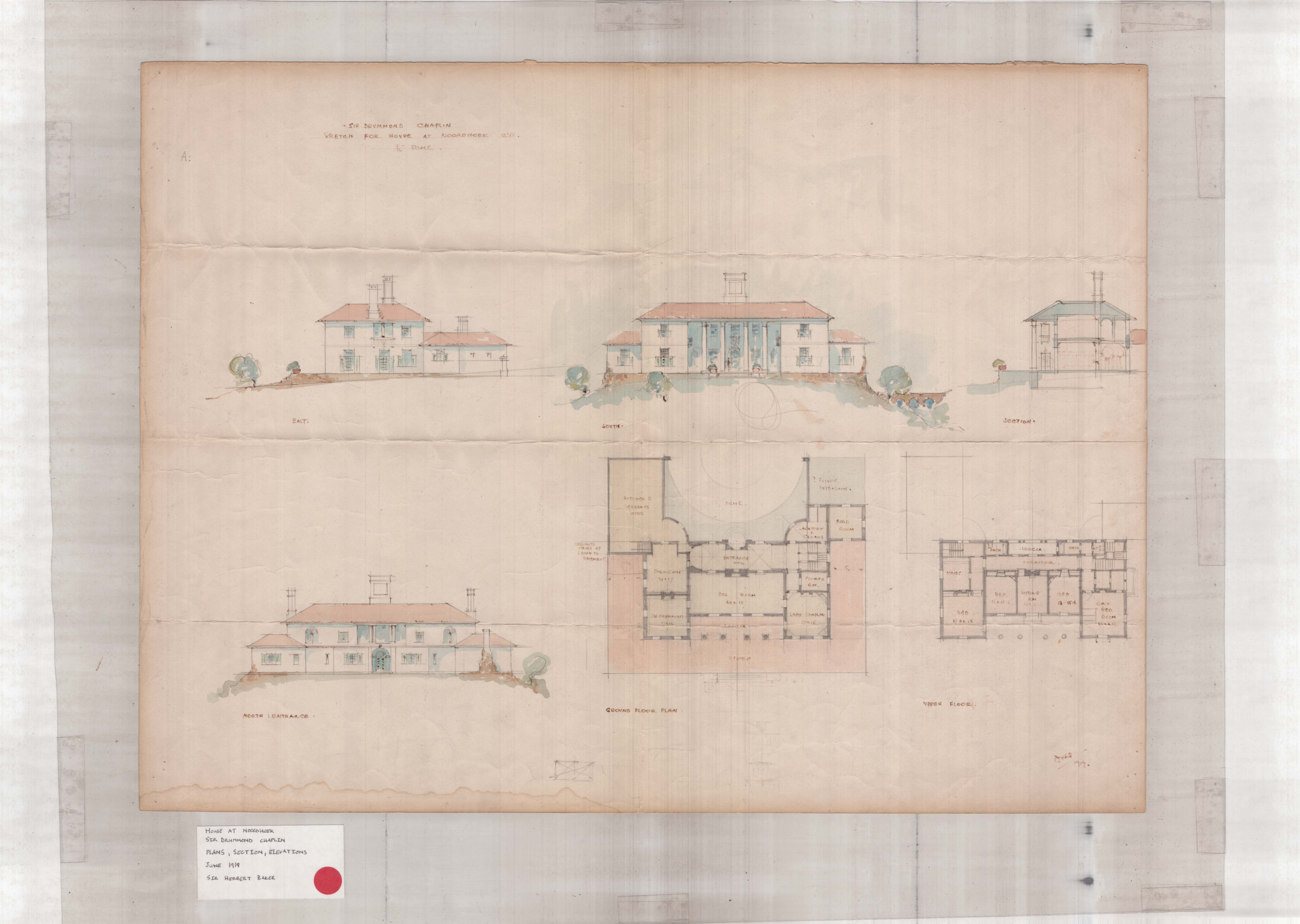 Baker, Herbert (Sir) 1919. Noordhoek House for Sir drummond Chaplin. Plans, sections and elevations.