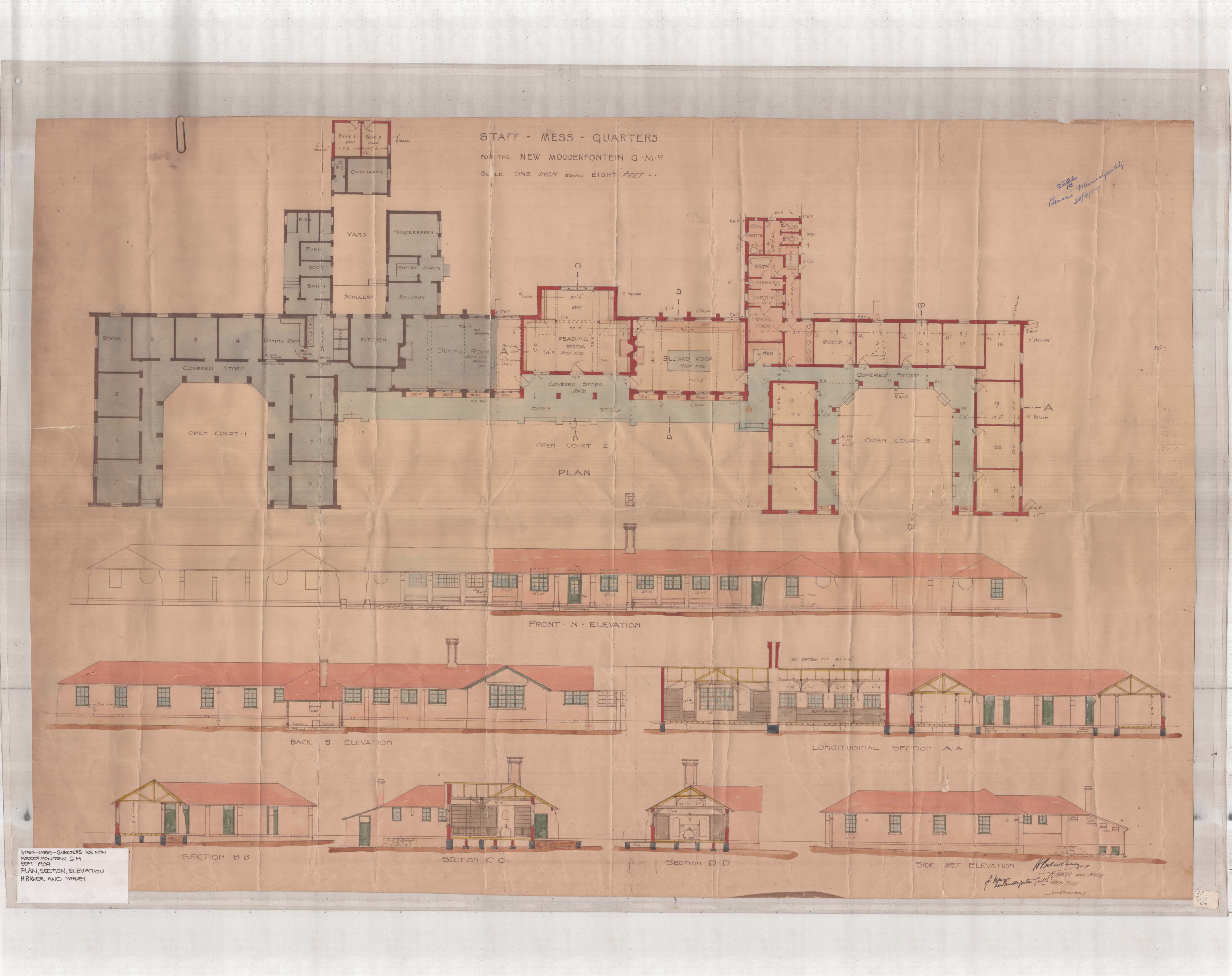 Baker, Herbert (Sir) and Masey. New Modderfontein additions to Staff MESS Quarters. Sept 1909 & Jun 1910. Ink & watercolours on paper.