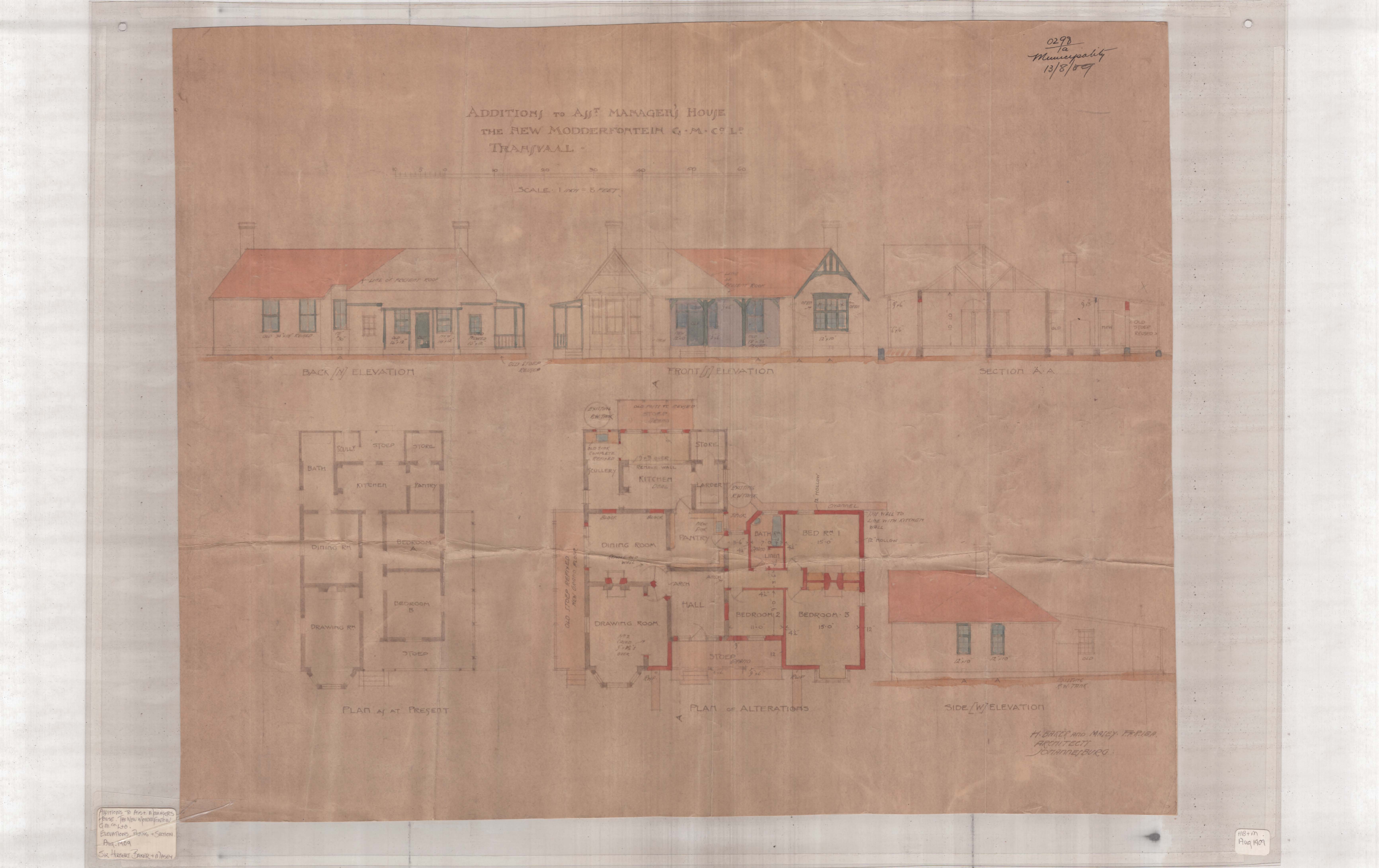 New Modderfontein Manager- & Assistant Manager's Houses, alterations & additions. Aug 1909 & 1910. Plans, sections & elevations.Ink & watercolour paints on paper.